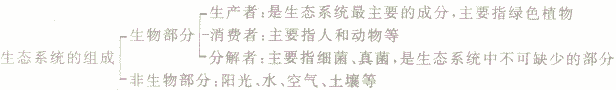 (1)生产者:自然界中能够进行光合作用制造有机物的生物。生产者通过光合作用制造的有机物不仅为自身的生长发育、繁殖等提供了物质和能量,而且也为其他分解者、消费者提供了源源不断的物质和能量。生态系统中的分解者和消费者是依赖绿色植物而存在的。由此可见,生产者是生态系统中最关键的组成成分。