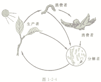 (3)分解者:是生态系统中将死亡的动植物的遗体分解的微生物。分解者把动植物遗体或残落物中的复杂的有机物分解成简单的无机物(如水、无机盐和,氧化碳等).这些物质又可以被绿色植物吸收和利用,在生态系统中促进了物质循环和能量流动,所以分解者是生态系统中不可缺少的组成部分。分解者主要是指细菌菌和真菌。生产者、消费者和分解者如图1?2?4所示。并不是所有的植物都是生产者,也有少数属于消费者,如菟丝子缠绕在大豆上,营寄生生活;动物大部分是消费者,但有的动物也起到了分解者的作用,如蚯蚓、蜣螂等腐生动物。