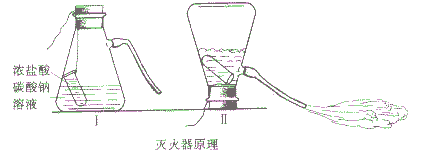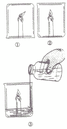 点燃三支蜡烛,在其中一支蜡烛上扣一只烧杯.将另两支蜡烛放在烧杯中,然后向其中只烧杯中加适量碳酸钠和稀盐酸如下图:![]() | ①在倒扣烧杯中的蜡烛熄灭 ②正放在烧杯中的蜡烛正常燃烧 ③加入适量碳酸钠和稀盐酸的烧杯中的蜡烛很快熄灭 | ①在倒扣烧杯中的蜡烛因钮气不足而熄灭 ②正放存烧杯中的蜡烛与氧气接触,温度保持在蜡烛的着火点以上,因此能正常燃烧 ⑧稀盐酸与碳酸钠迅速反应产生大量的二氧化碳气体,二氧化碳既不燃烧也不支持燃烧,所以蜡烛很快熄灭。 |