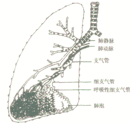 支气管入肺后反复分支,愈分愈细,形成许多树枝状的分支,这甚分支的结构与气管相似,但随其管径变小,管壁变薄,软骨环逐渐变小,平滑肌则相对地逐渐增加。分支到细支气管口(口径在1毫米以下的小管)时,管壁的软骨环消失,管壁几乎全部由平滑肌构成,它的收缩和舒张影响着细支气管口径的大小。从而控制进出肺内的气体量。细支气管再分支到呼吸性细支气管时,其管壁的某些部位向外突出,形成肺泡。因此,肺内含有大量的肺泡.