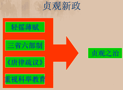 2、唐太宗引隋之苛政为戒,调整统治政策,纠正前朝之弊端,认识到皇帝要勤于政事,大臣要廉洁奉公,政府要轻徭薄赋,发展生产。唐太宗是我国封建社会时期杰出的政治家,他善于用人,勇于纳谏,不断调整统治政策,他的个人作用也是“贞观之治”局面形成的重要因素。