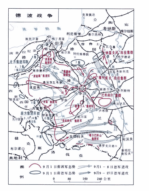 1939年9月1日凌晨,德国实施白色方案,德国军队利用夜幕的掩护,在2300多架飞机的支援下,对波兰发动突然袭击,第二次世界大战全面爆发。当航空兵和装甲部队结合起来时,全世界第一次领教了。9月3日,英国和法国对德国宣战,虽然英国和法国之前已经保证会确保波兰的安全,但是波兰的抗战并没有得到英法两国任何有效的军事支持。波兰的军队很快被装备精良的德军击溃。9月6日,波兰政府逃离华沙。9月17日,华沙保卫战开始,几乎在同一天,苏联红军进入波兰东部。9月27日,德军占领华沙,波兰在复国20年后,又一次消失了。