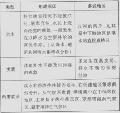 暴雨洪水 | 主要有台风、锋面等带来的暴雨 | 东部季风区各大江河的中下游平原 | 时间上与暴雨时间存在高度一致性,在东部季风区,暴雨集中发生在每年的4?9月,自南向北推移 |