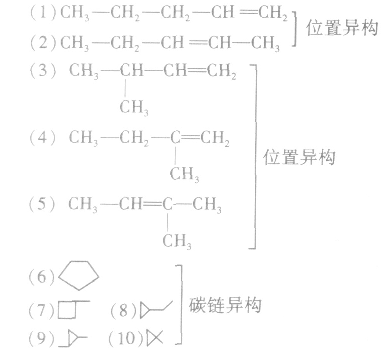 2.烯烃的同分异构体的写法分子组成符合CnH2n的烃除烯烃外,还有环烷烃 (n≥3),并且烯烃中双键的位置不同则结构不同,有的烯烃还存在顺反异构,所以烯烃的同分异构体比烷烃复杂得多。以C5H10为例说明同分异构体的写法: