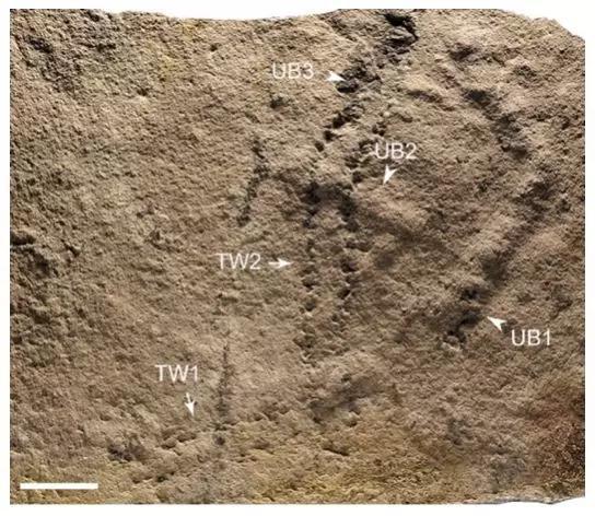 远古生物留下的凹陷脚印(图中TW),以及菌席下部活动形成的潜穴(图中UB)。图片在这次的发现中,化石上的足迹呈对称的两组,两边的脚印宽度保持一致,虽然稍显不规律,但大体上呈重复出现。表明留下这一系列印记的动物,已经能够依靠附肢支撑起身体“行走”,而不是可怜兮兮地在泥浆里拖拉,摩擦肚皮。这些证据还表明,留下印迹的小家伙,脚是对称分布的。