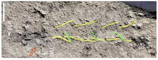 下面这张就是地质学家们拍下的一张“案发现场”照片。这一现场为我们提供了两部分关键线索:一部分是菌席(众多微生物聚在一起生活后形成的像席子一样的东西)上部1-2厘米长,约1毫米深的凹陷脚印,另一部分是脚印主人在菌席下部活动形成的潜穴。