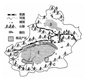 (1)农业:畜牧业与绿洲农业,主要的牧场有天山牧场和阿尔泰山牧场,绿洲农业属于灌溉农业(种植业),主要分布于塔里木盆地和准噶尔盆地的边缘(水源主要来自高山冰雪融水和地表水),农作物有长绒棉、甜菜、小麦等。